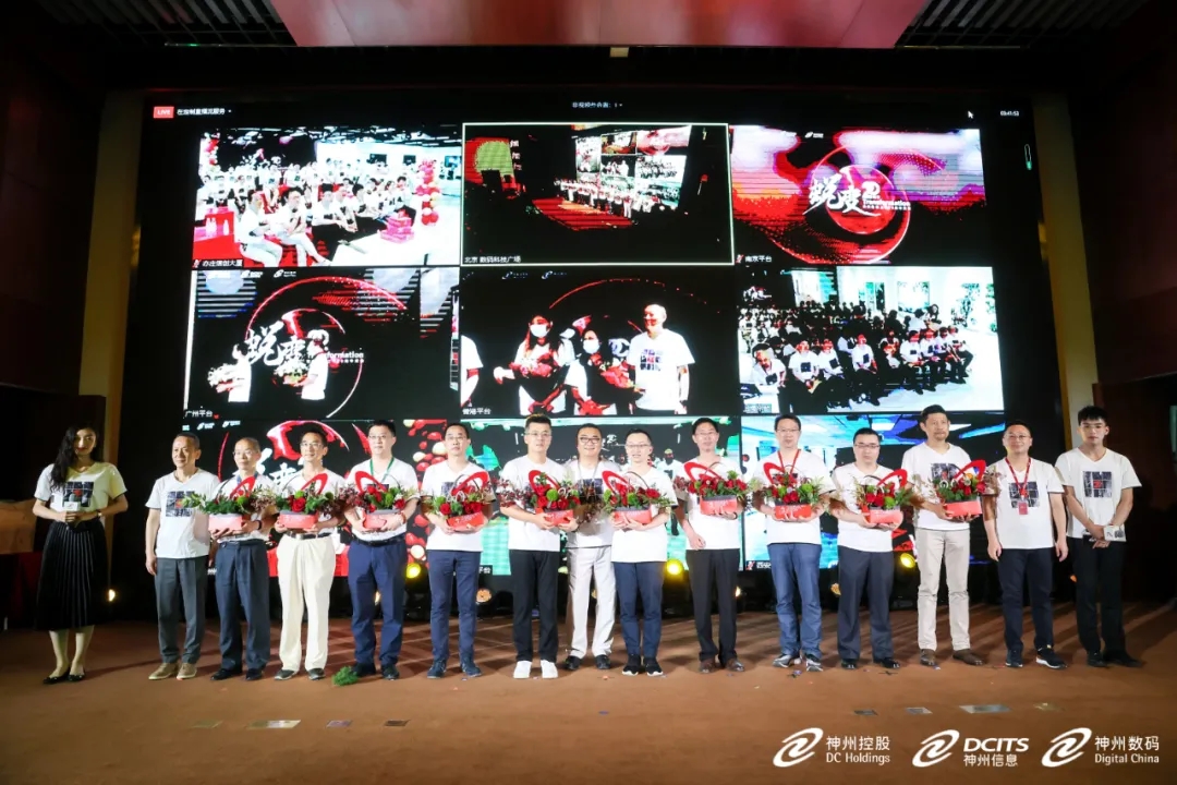 在二十年员工授勋环节,神州控股董事局副主席林杨、神州信息总裁李鸿春、jcjc5500公海集团常务副总裁叶海强及其他分会场高管,分别为主会场及分会场20年员工代表授勋。